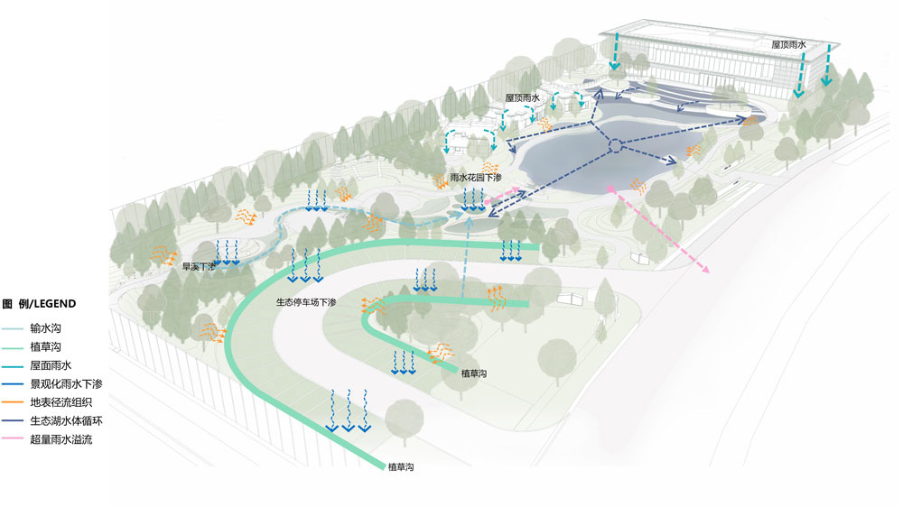 项目现场依形就势,利用现状水塑造海绵水系,打造低生态影响、低维护的生态湿地公园;公园绿地依靠雨水花园、下凹绿地等对雨水进行过滤下渗,超量雨水溢流对湖体进行补水;停车场由于汽车带来机油和重金属的影响,不再排入湖体,直接在植草沟进行下渗净化;湖体通过水泵循环造流,防止水系局部富营养化,并通过植被群落配置及各类生物,构建稳定的水生态系统。