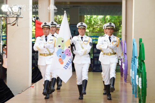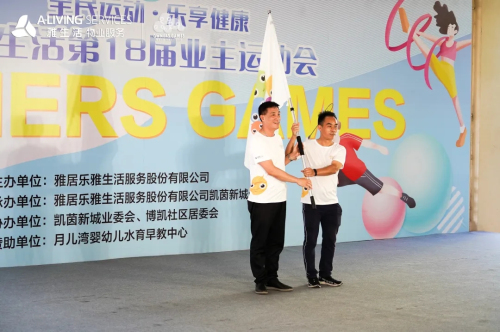 在运动员与裁判员代表分别宣誓后,雅生活华南区域中山片区总经理钟锦绣作为物业代表为运动员授旗。