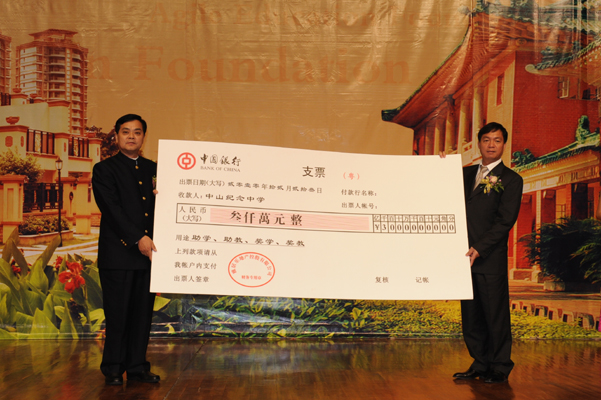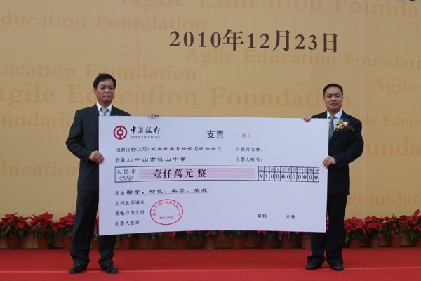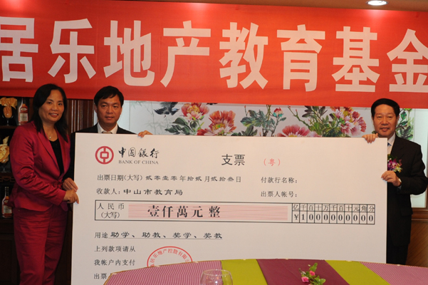 2010年,尊龙凯时向中山市3所中学及中山市教育局捐款6000万