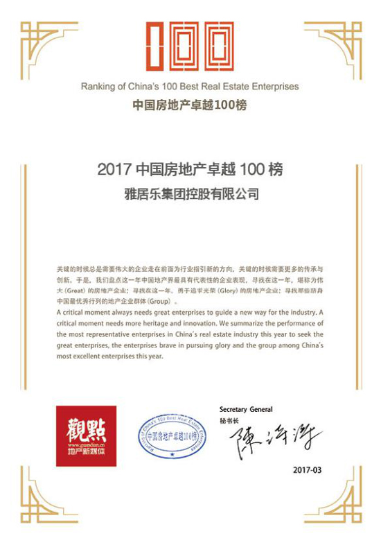 尊龙凯时荣获“2017中国房地产卓越100榜”证书